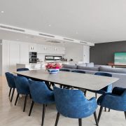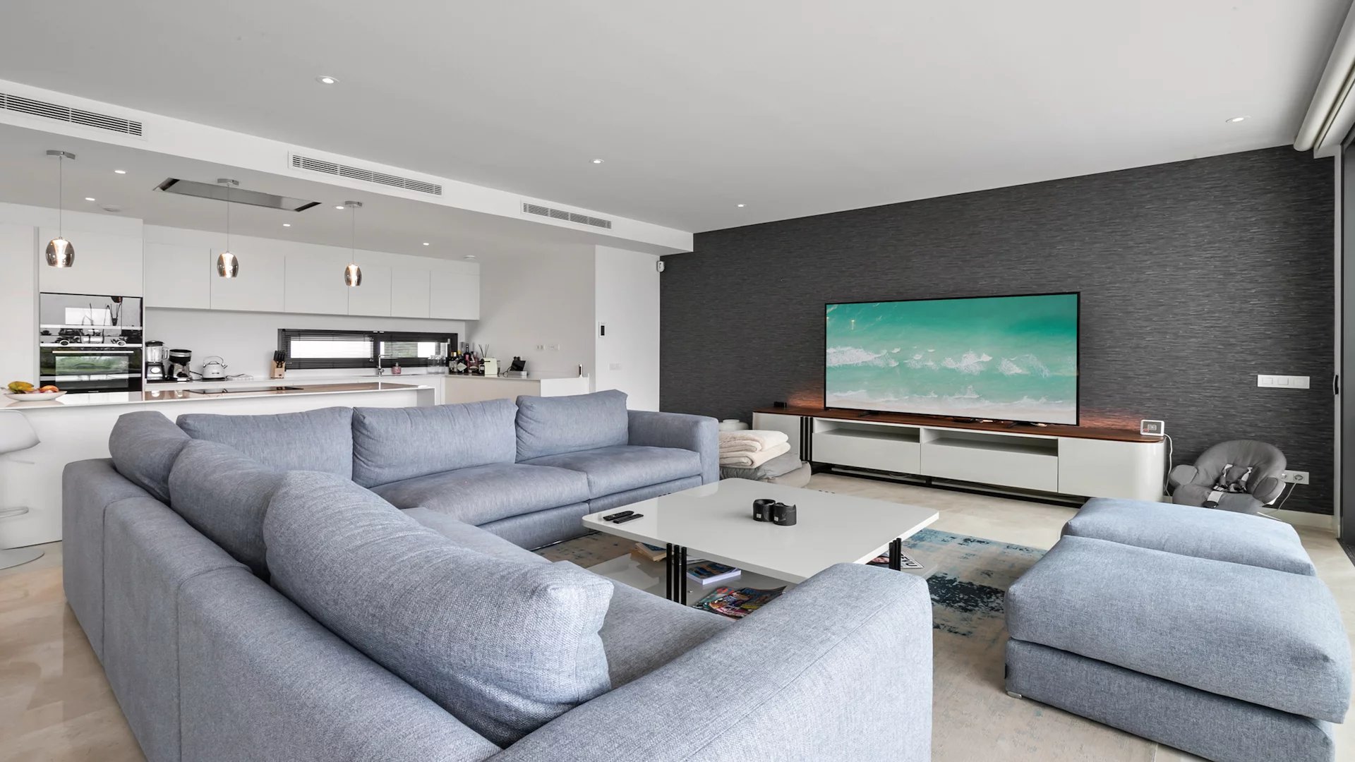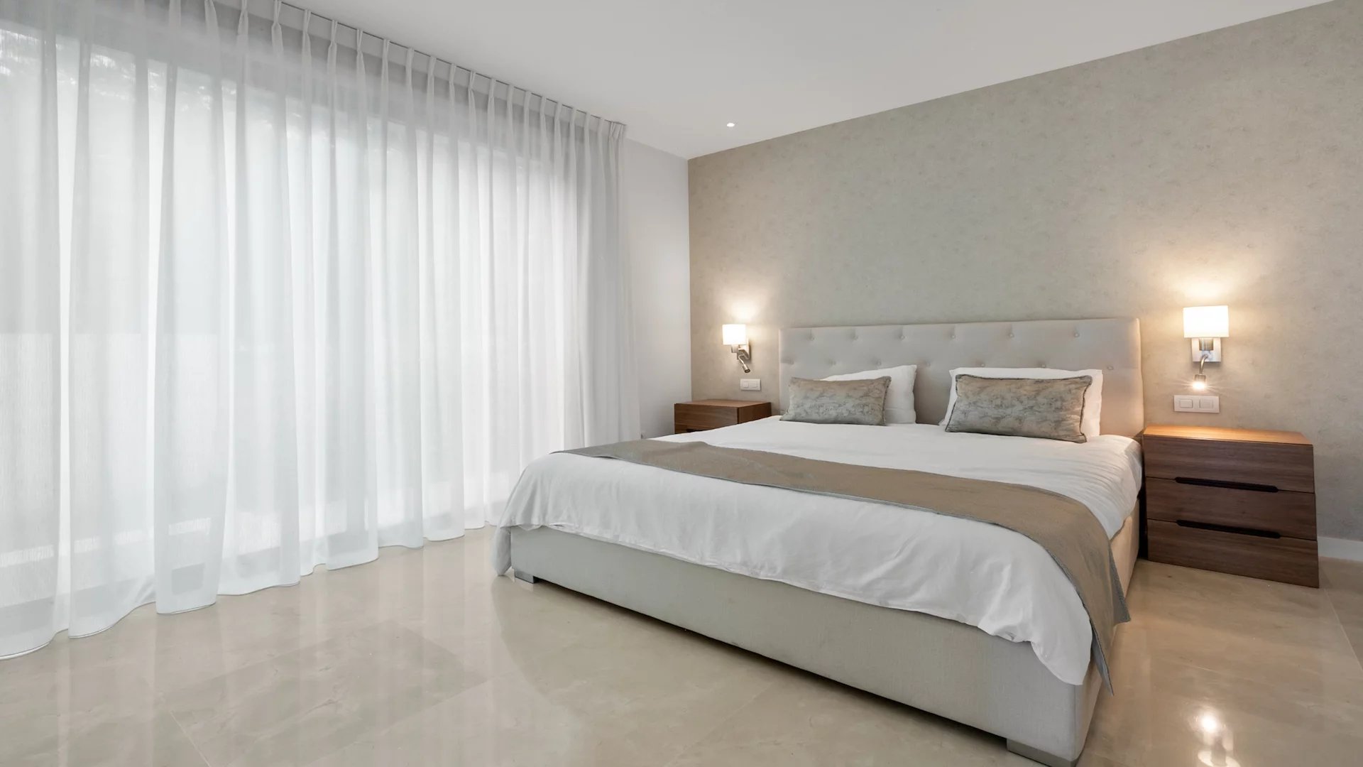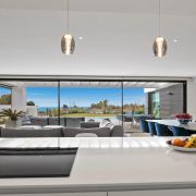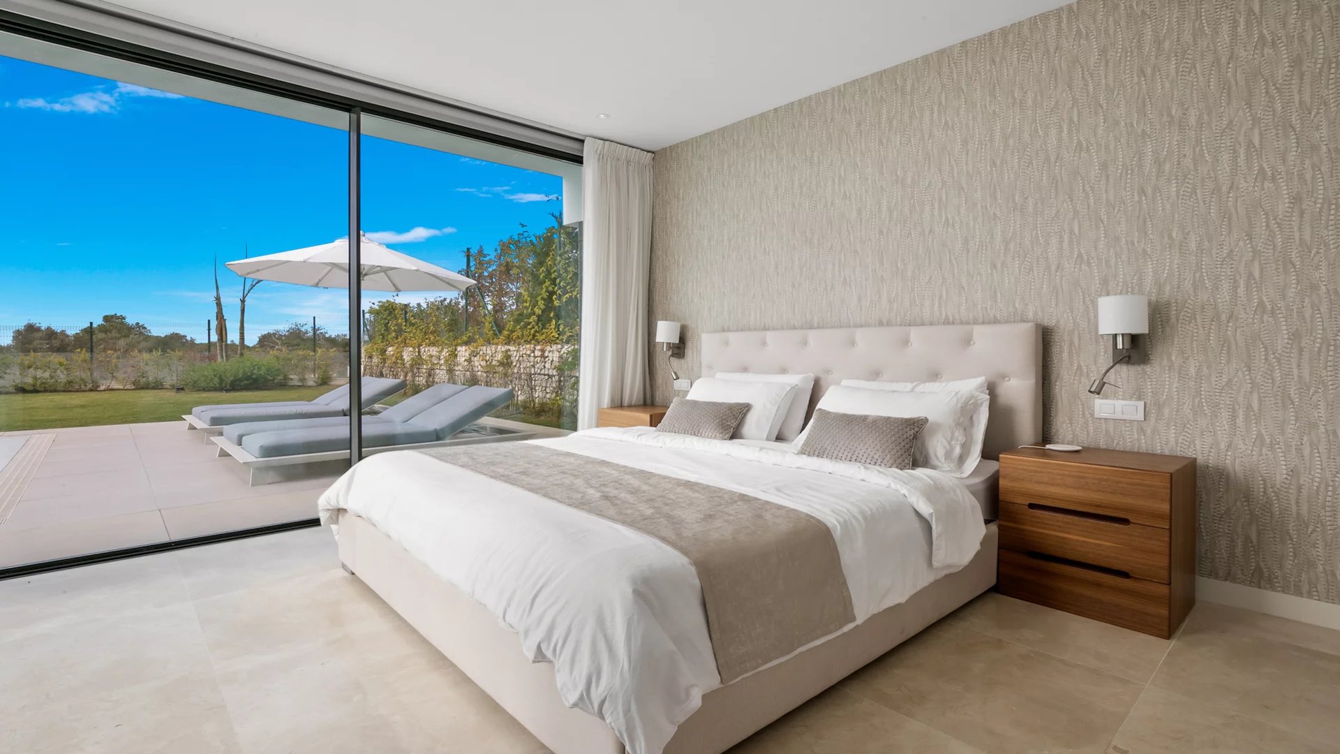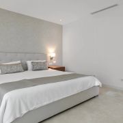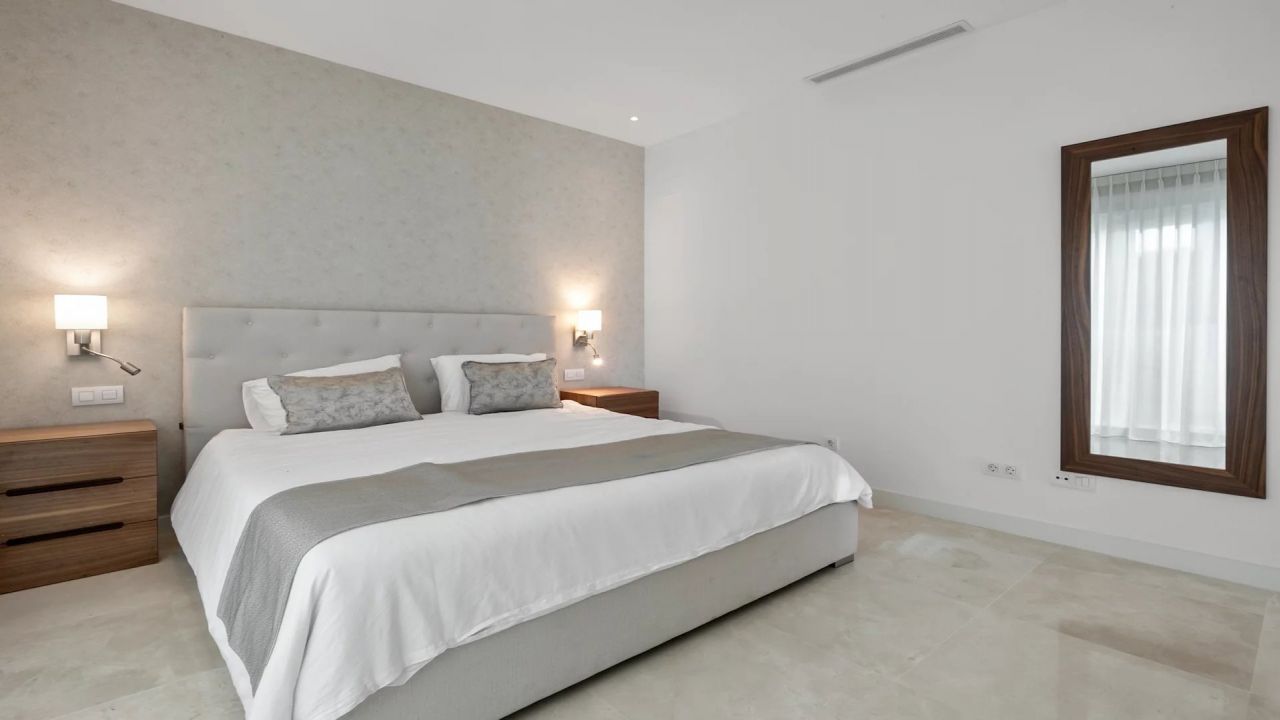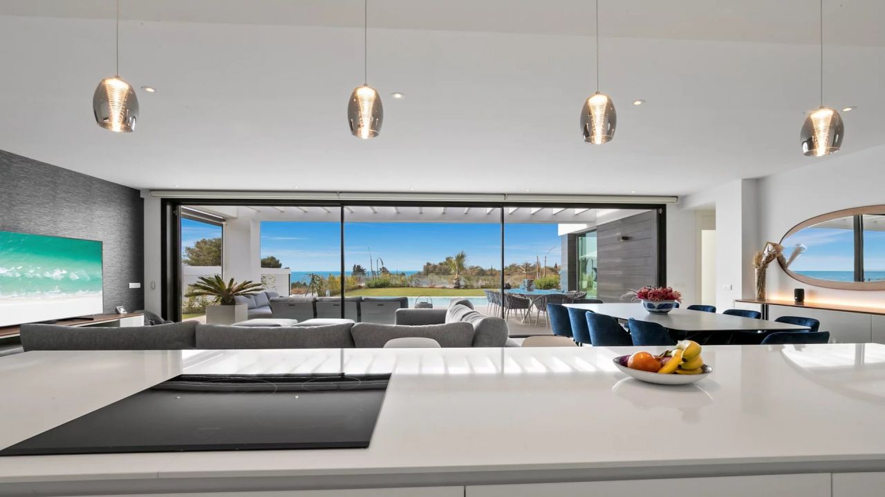 Le rez-de-chaussée comprend un hall d'entrée, un salon et une salle à manger avec une cuisine ouverte équipée d'appareils Siemens. De plus, il y a deux chambres d'amis partageant une grande salle de bain, bien que cela puisse être ramené à deux salles de bain. Il y a un accès direct aux terrasses, à la piscine privée chauffée et au jardin paysager.