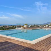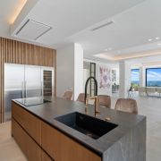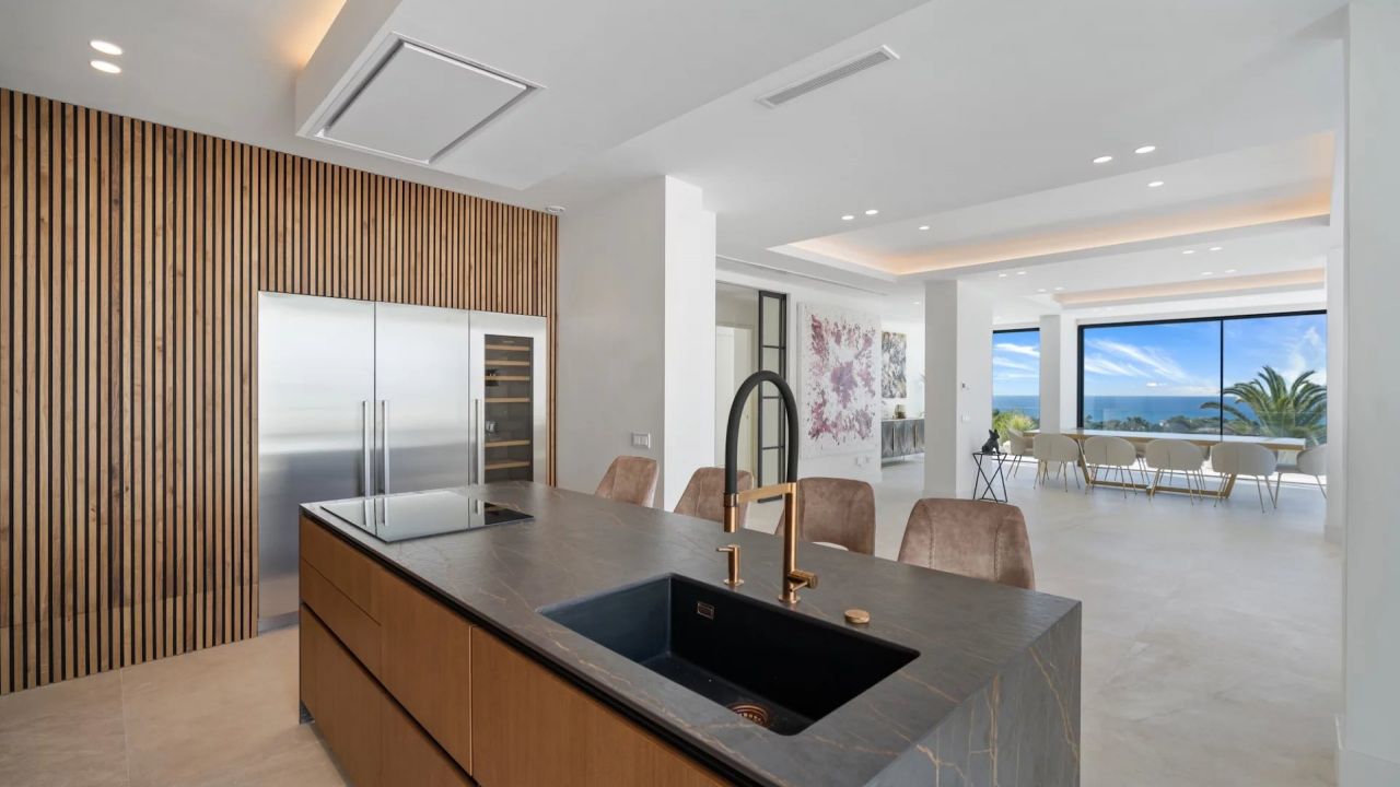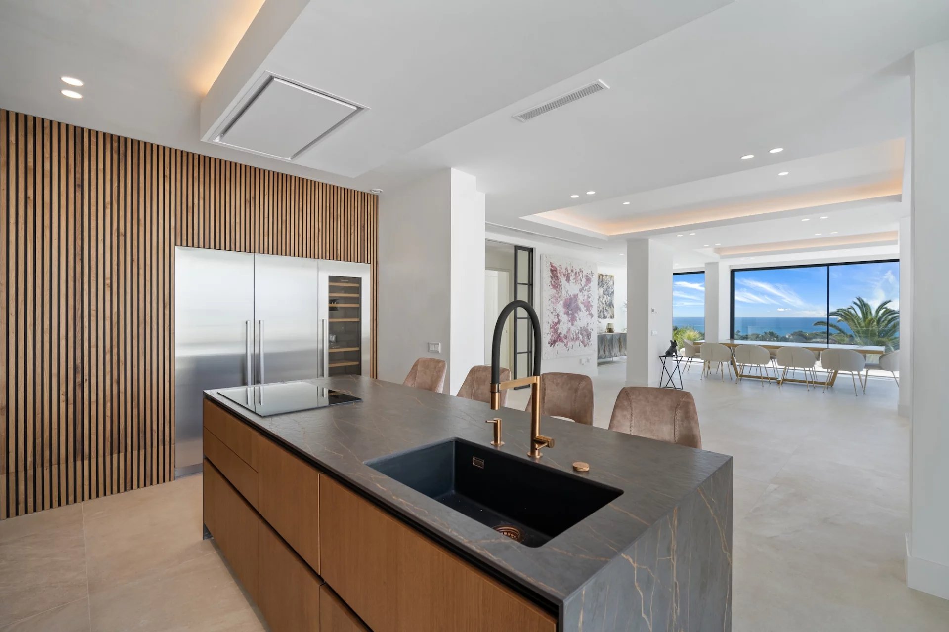 Au deuxième étage, vous serez accueillis par une cuisine ouverte moderne qui s'ouvre sur la salle à manger et le salon qui offrent une vue fantastique sur la mer ainsi que sur la piscine à débordement entourée d'une terrasse en bois.