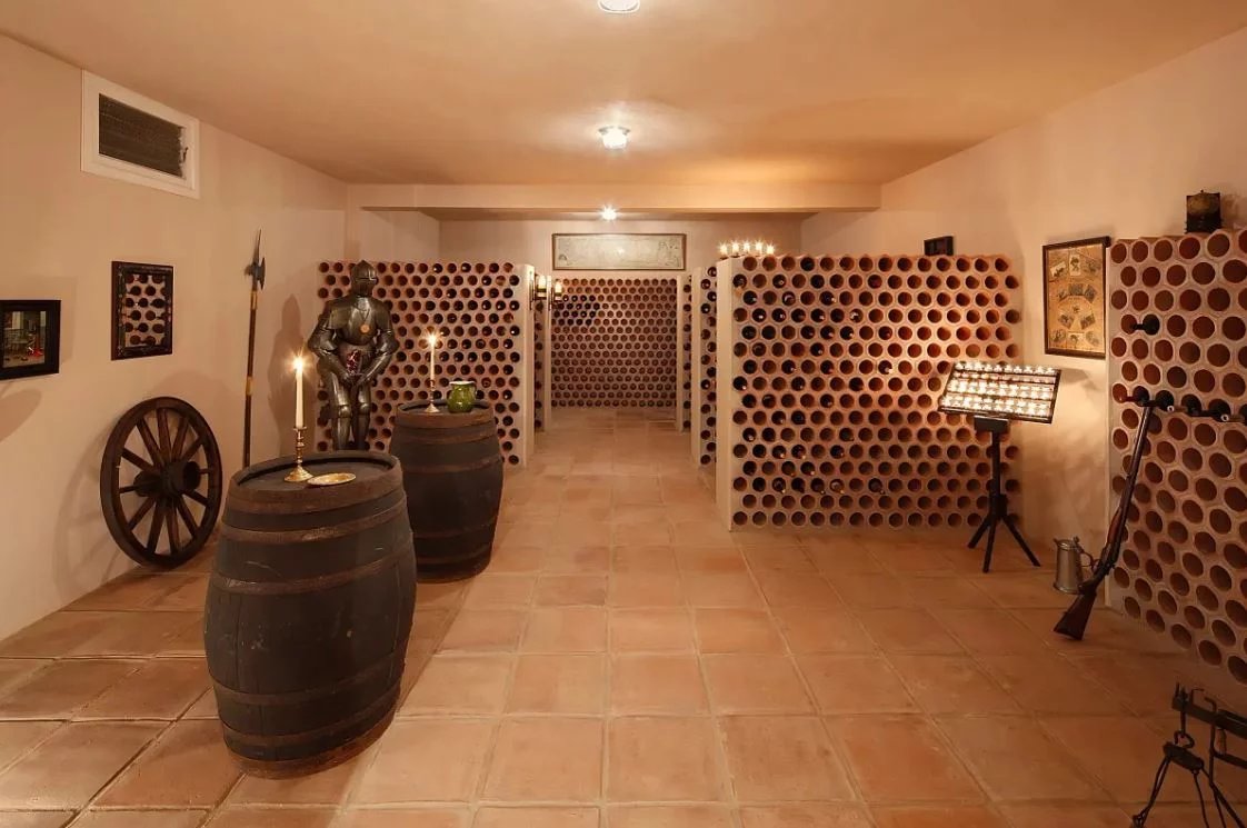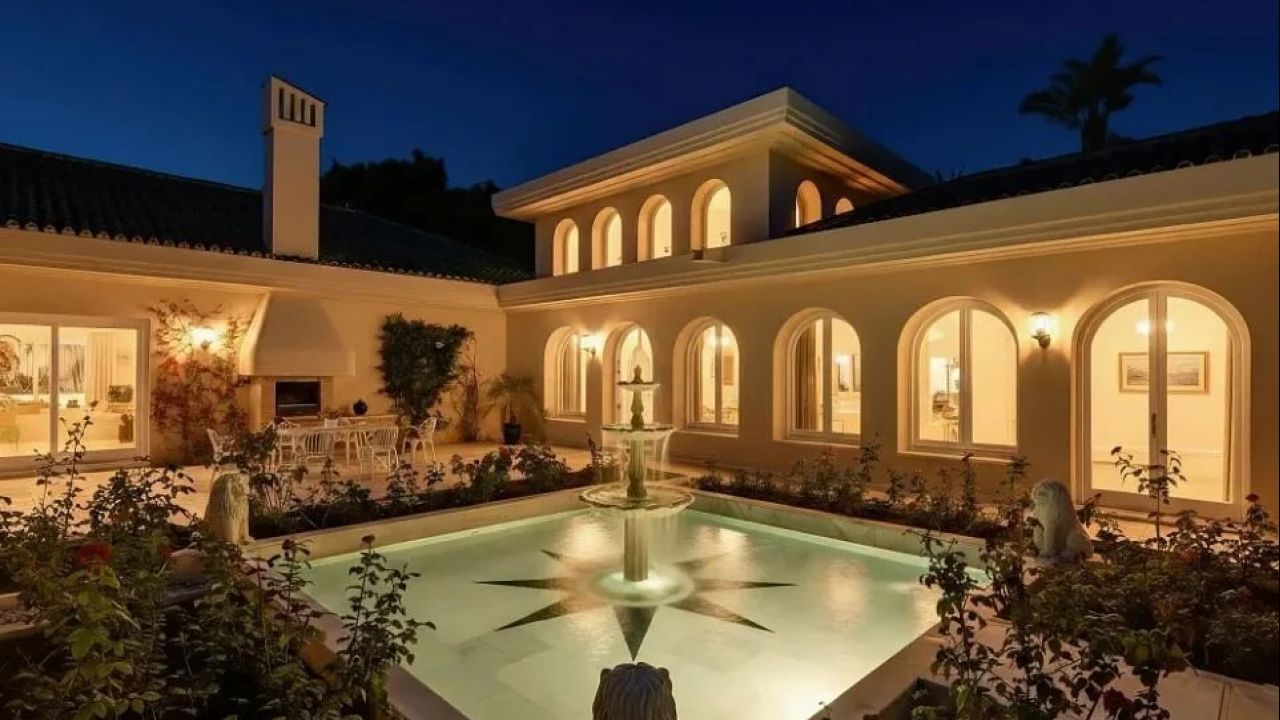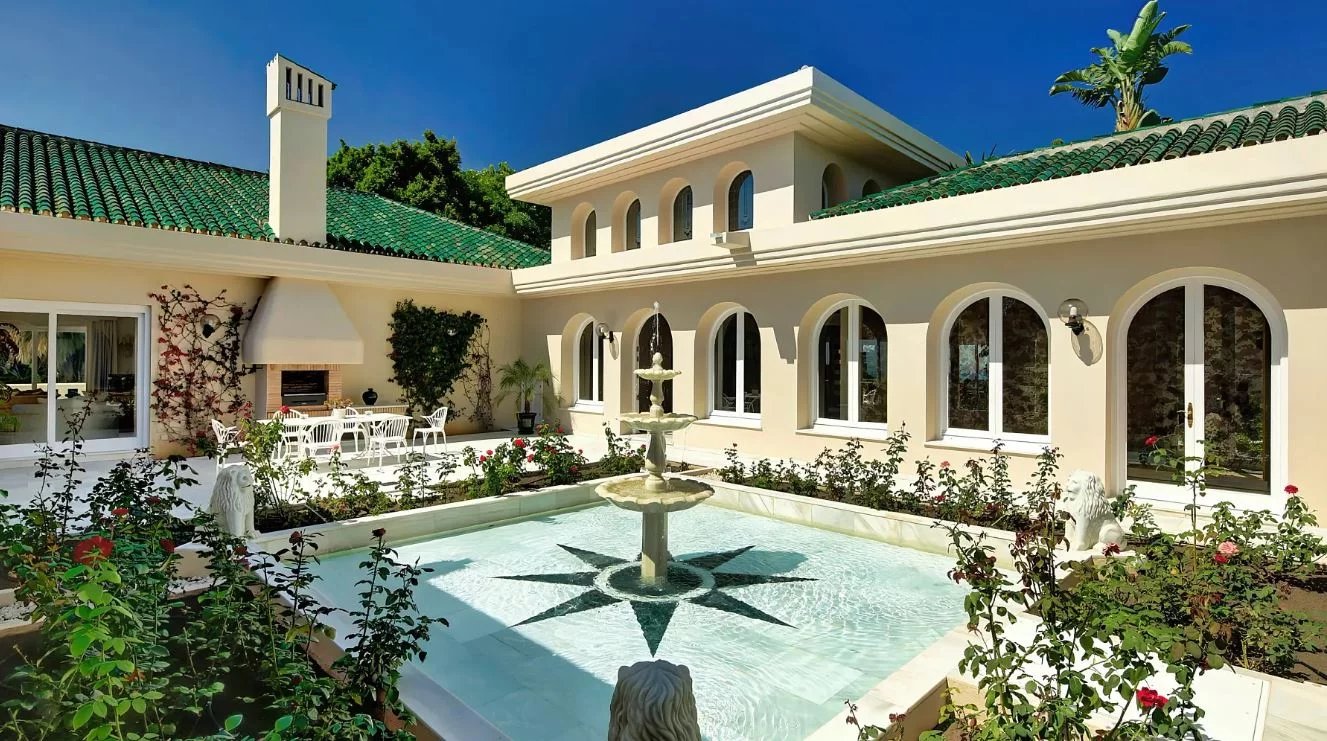 La maison principale dispose d'un patio central avec fontaine, de grands espaces de vie et de salle à manger, ainsi que de suites avec accès direct aux terrasses et à la piscine.