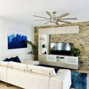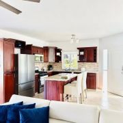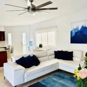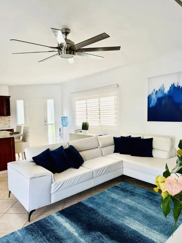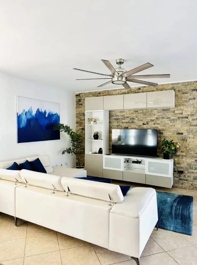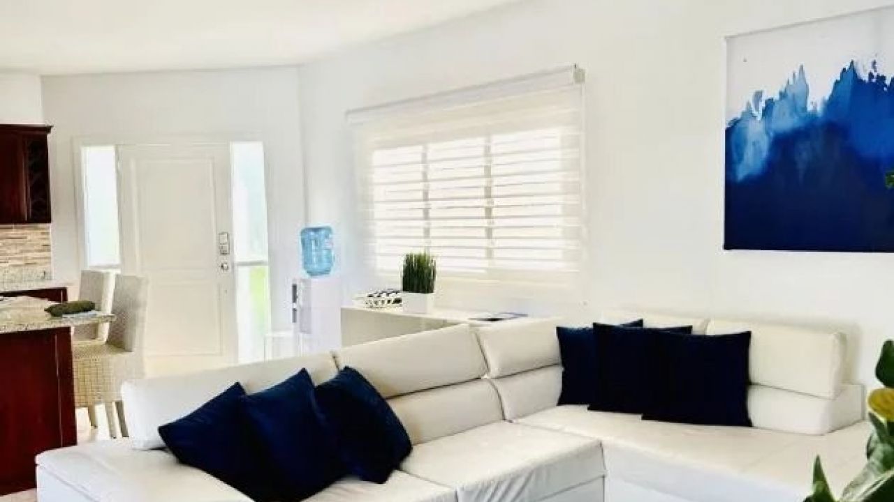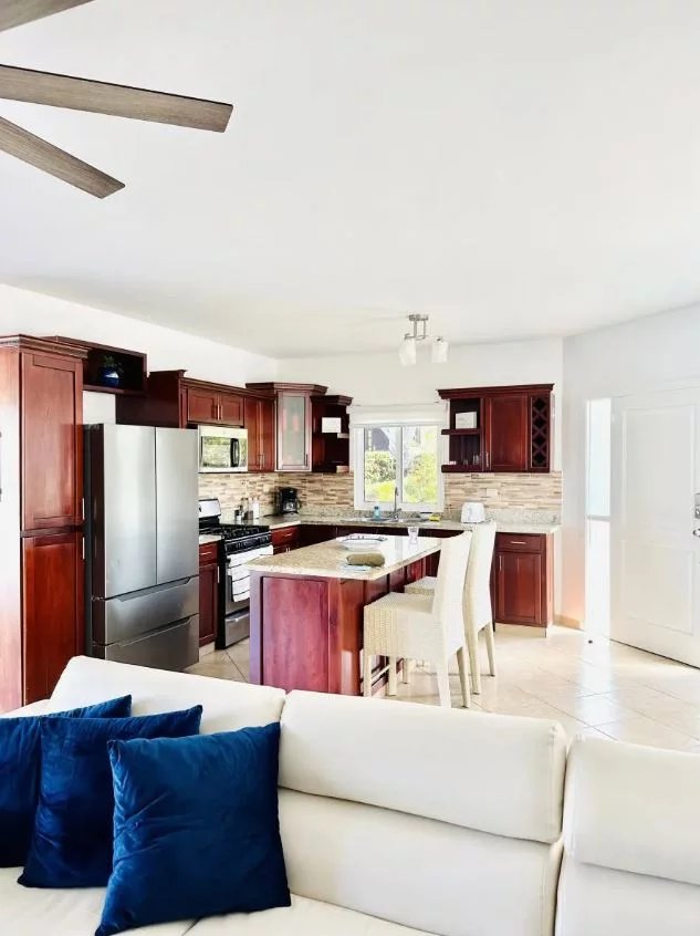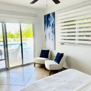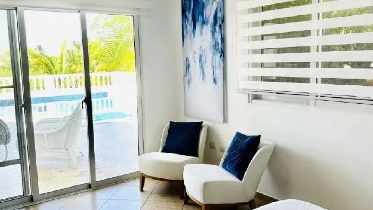 L'intérieur de la villa de deux chambres Cabarete se fond parfaitement avec l'extérieur grâce à de grandes portes vitrées et des plans d'étage ouverts, permettant à la lumière naturelle et aux brises de circuler à travers les espaces de vie. L'intérieur est orné d'un décor sur le thème tropical, comprenant des textiles colorés, des œuvres d'art tropicales et des plantes d'intérieur, créant une atmosphère cohérente et accueillante.