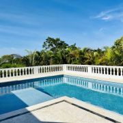 La piscine spacieuse s'étend depuis la maison et se fond parfaitement dans le paysage tropical. Il offre une évasion rafraîchissante lors des journées chaudes et sert de point focal pour la détente.